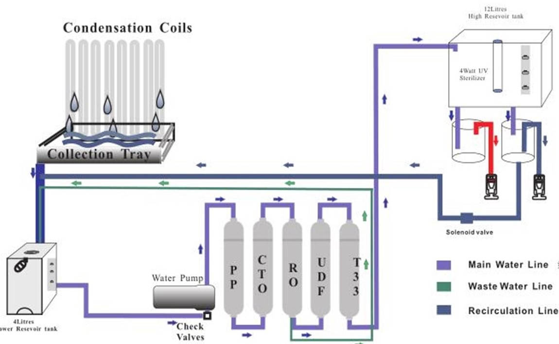 In a water generator, the goal is to reclaim that condensed water vapor, filter it, and then store it in a holding tank or send it to where it can be used. The reclaimed water is filtered a number of times to take out airborne particles and bacteria as part of the process.